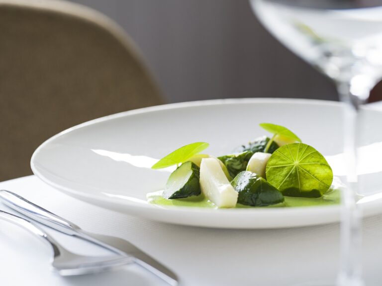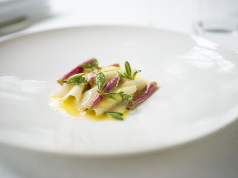 Mise en Bouche – Lisette marinée au balsamique, betterave fumée et crème crue rafraichie à la menthe poivrée – Poisson sauvage cuit à la nacre,