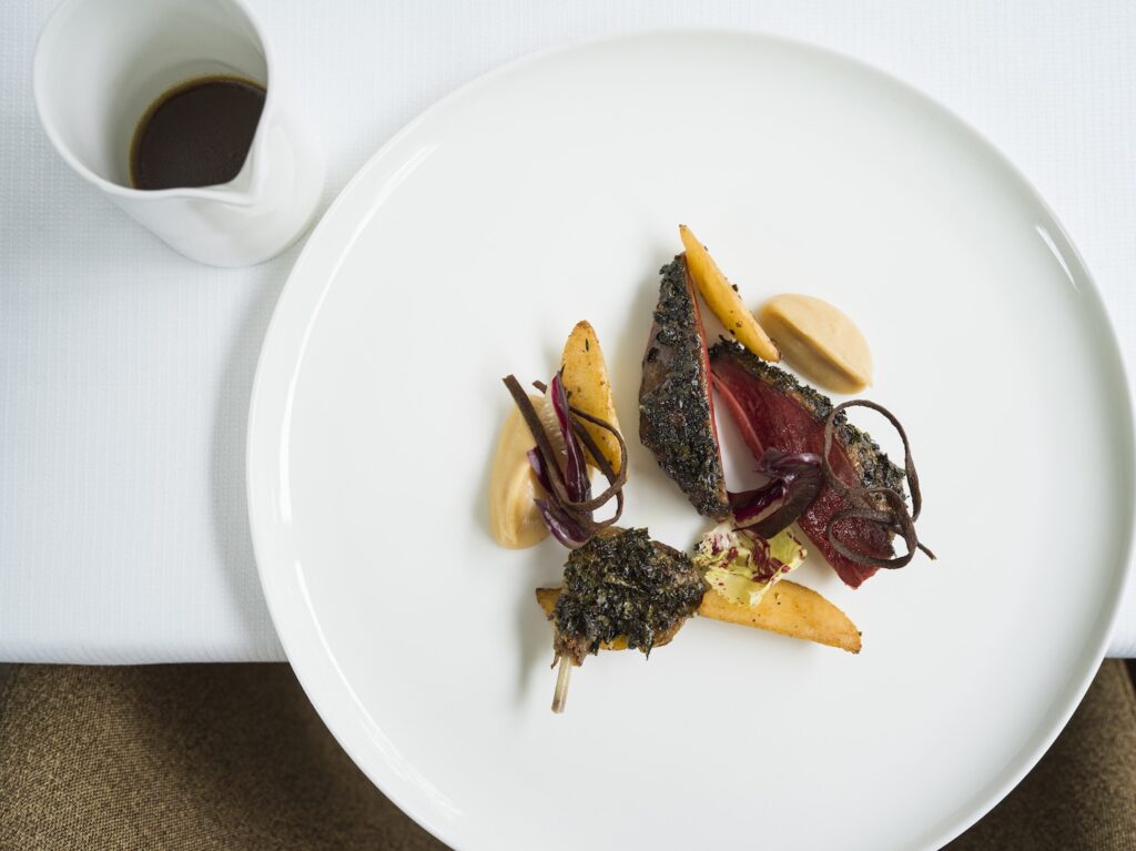 Mise en Bouche – Noix de Saint-Jacques et feuillage d’hiver à l’huile de noix, sabayon chaud à la tome de Rhuys et vin de voile – Tourte feuilletée de céleri rave et truffe noire, beurre monté aux herbes à soupe – Pêche côtière marquée sur le grill, jeunes blettes cuisinées aux coquillages, sauce pistache et […]